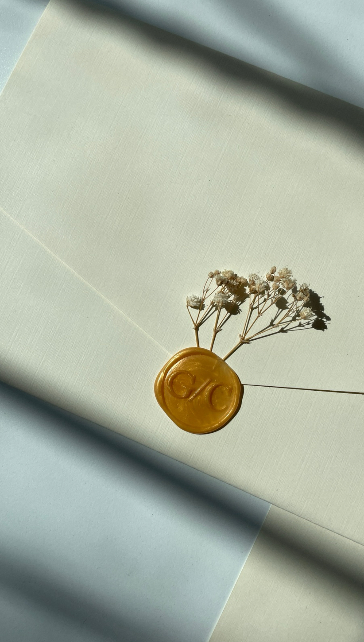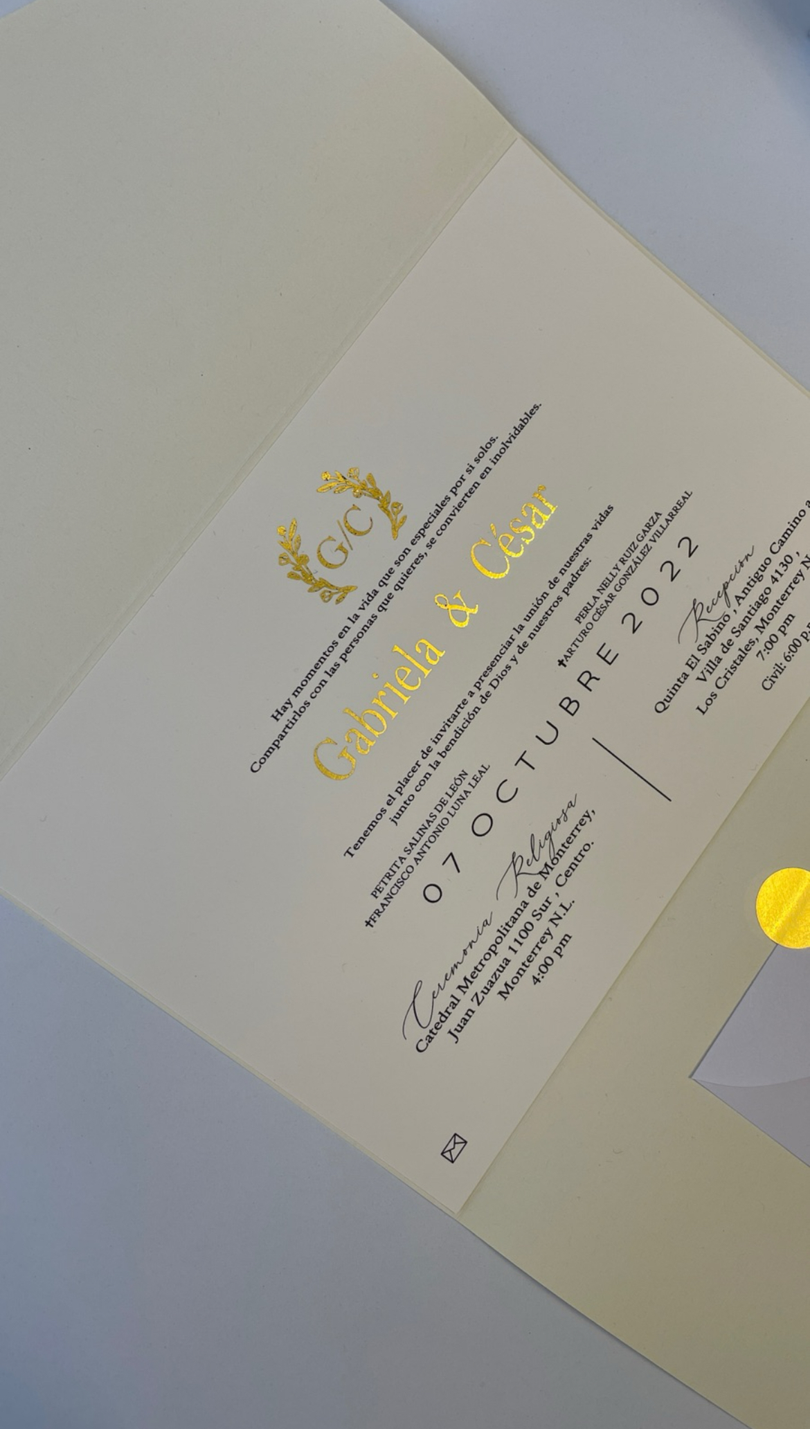 Invitación con sobre tipo tríptico de medida 14 x 21 cm en tono ivory liso, el diseño personalizado impreso en opalina gruesa ivory con foil dorado en nombres y monograma, incluye sobre de dinero y para cerrar las invitaciones sello lacre con diseño estándar y naturaleza muerta. (El sello personalizado tiene costo adicional)