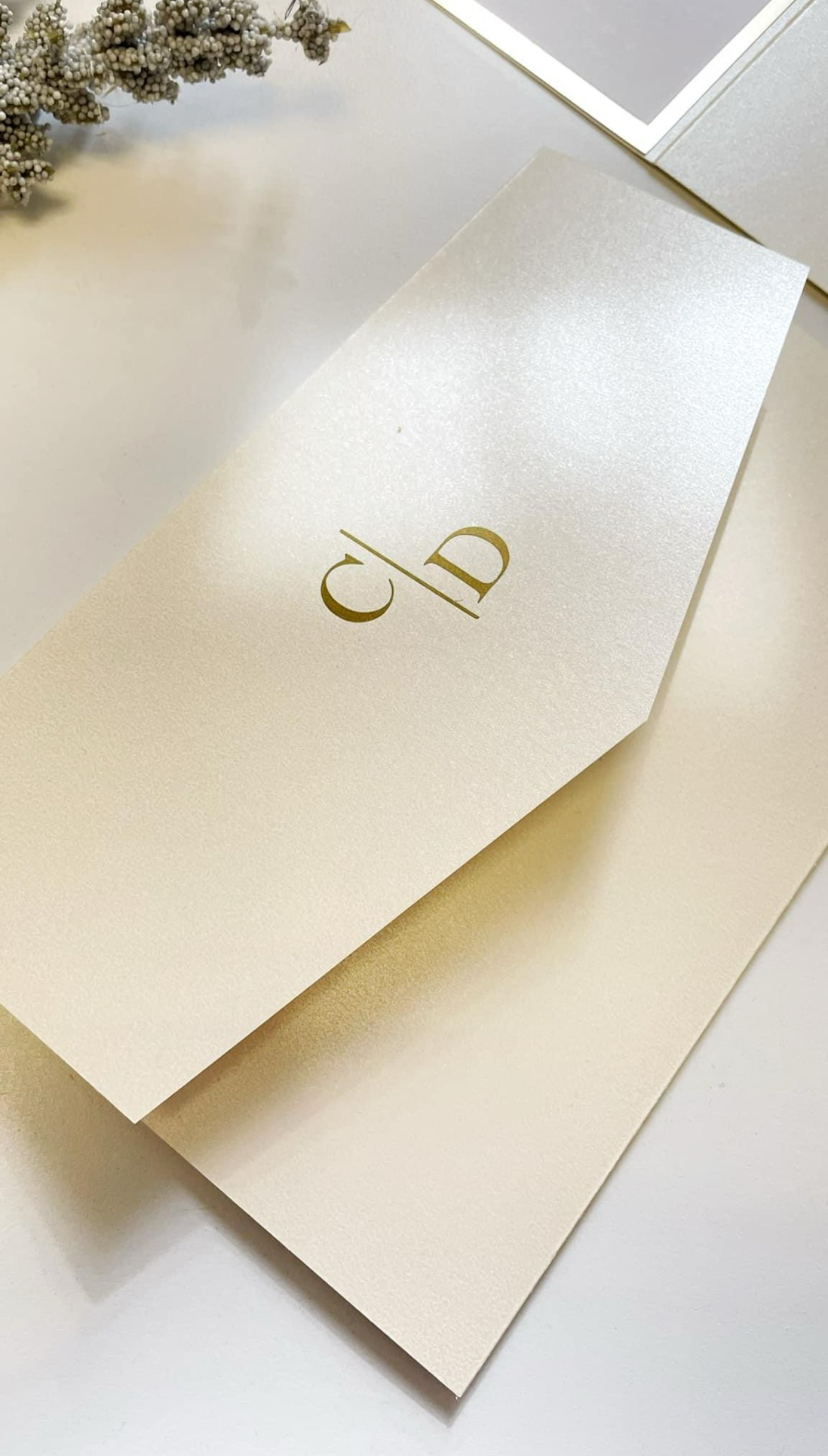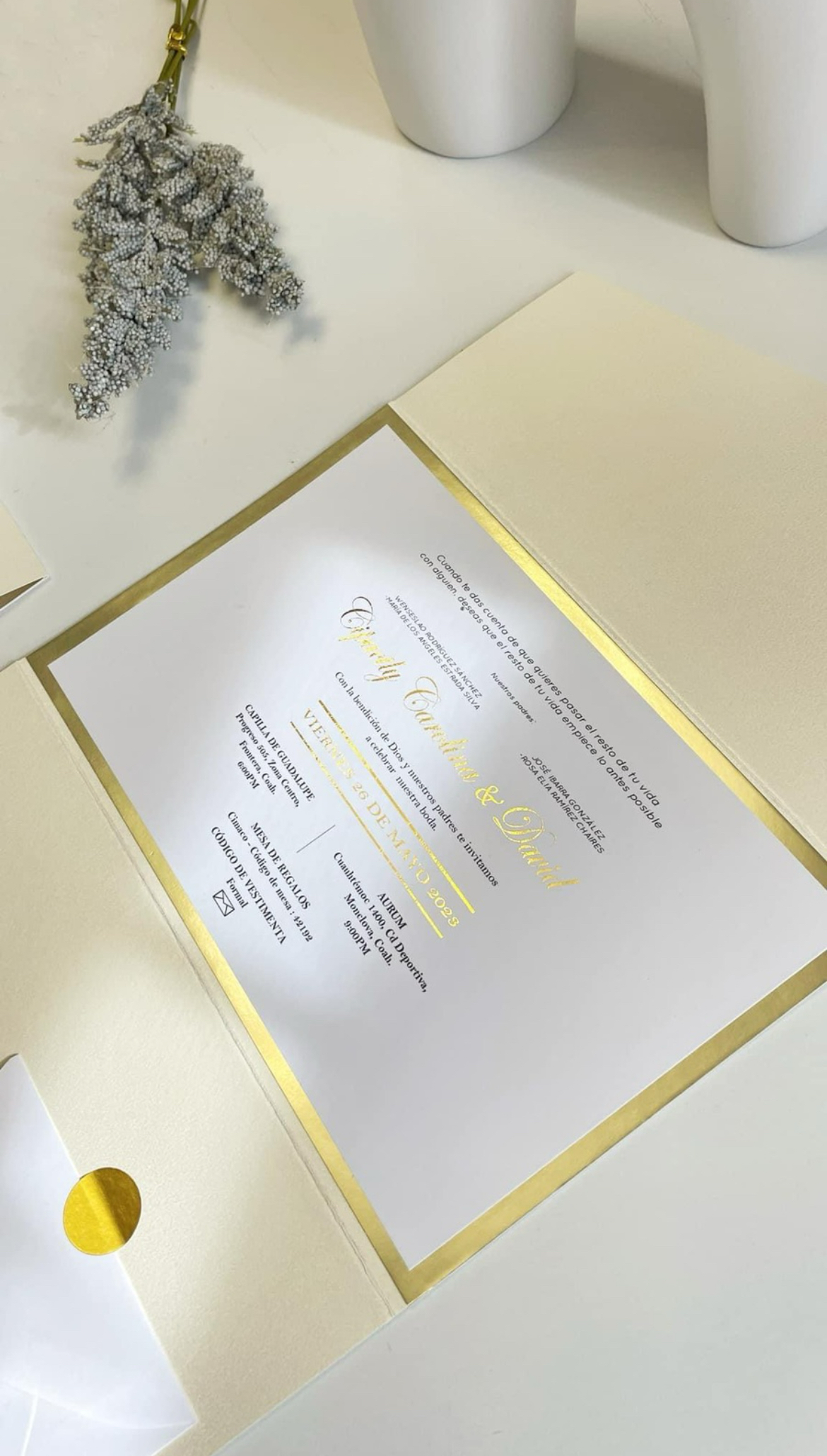 Invitación con sobre tipo tríptico de medida 14 x 21 cm en tono ivory satinado, vinil dorado con iniciales por fuera del sobre en la parte de enfrente, el diseño personalizado impreso en opalina gruesa blanca con foil dorado en nombres y marco en papel metálico dorado, incluye sobre de dinero blanco, un pase de medida 9 x 5 cm y para cerrar las invitaciones sello de sticker dorado.