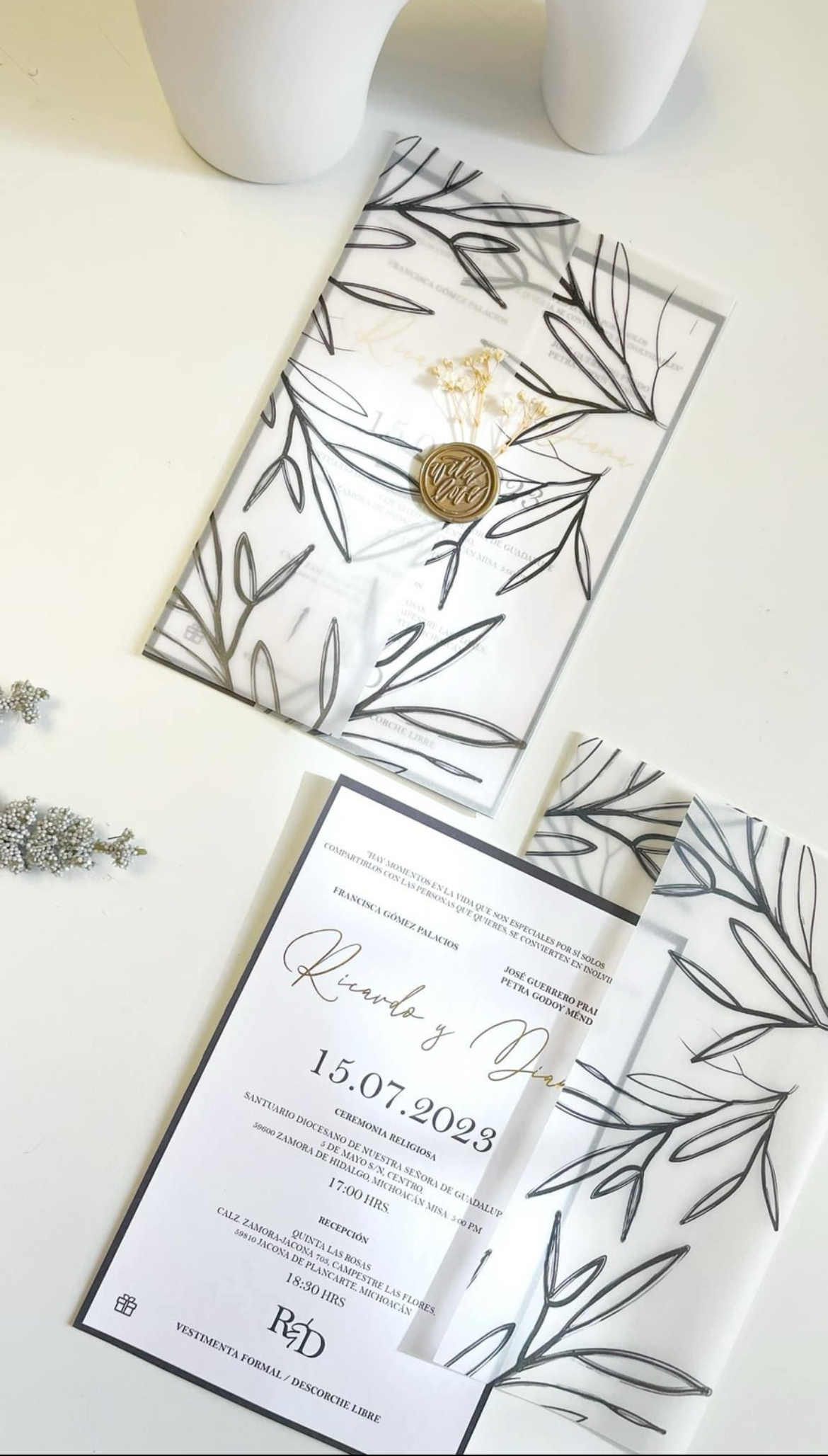 Invitación con sobre tipo tríptico de medida 14 x 21 cm en papel transparente, impresión por fuera del sobre, el diseño personalizado impreso en opalina gruesa blanca con foil dorado en nombres, incluye sobre de dinero blanco y para cerrar las invitaciones sello lacre con diseño estándar.