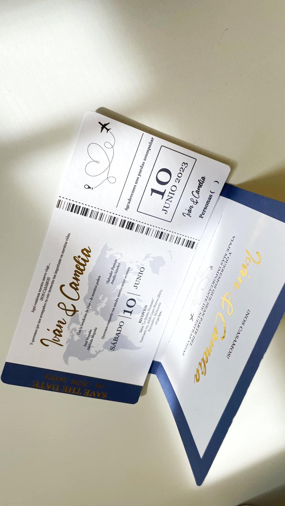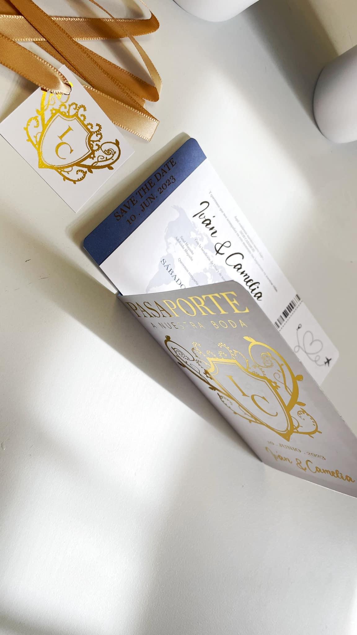 Invitación de medida 14 x 10 cm, sobre tipo pasaporte en tono blanco con foil dorado en la portada, el diseño personalizado con foil dorado en sus nombres, listón café y etiqueta con sus iniciales con foil dorado, incluye sobrecito de dinero blanco y un pase de medida 9 x 5 cm.