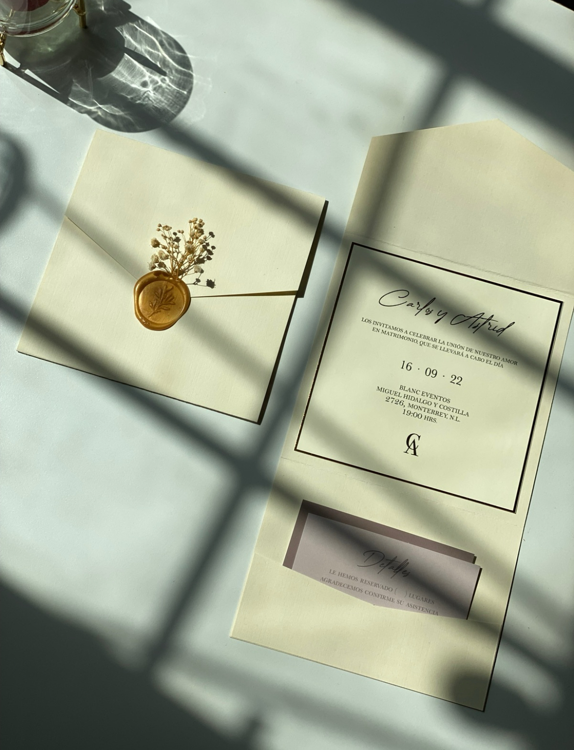 Invitación con sobre tipo tríptico de medida 14 x 14 cm en color ivory, el diseño personalizado impreso en opalina gruesa ivory con foil dorado en sus nombres, fecha e iniciales, incluye bolsillo con dos tarjetas de medida 9 x 5 cm y para cerrar las invitaciones sello lacre con diseño estándar y naturaleza muerta.