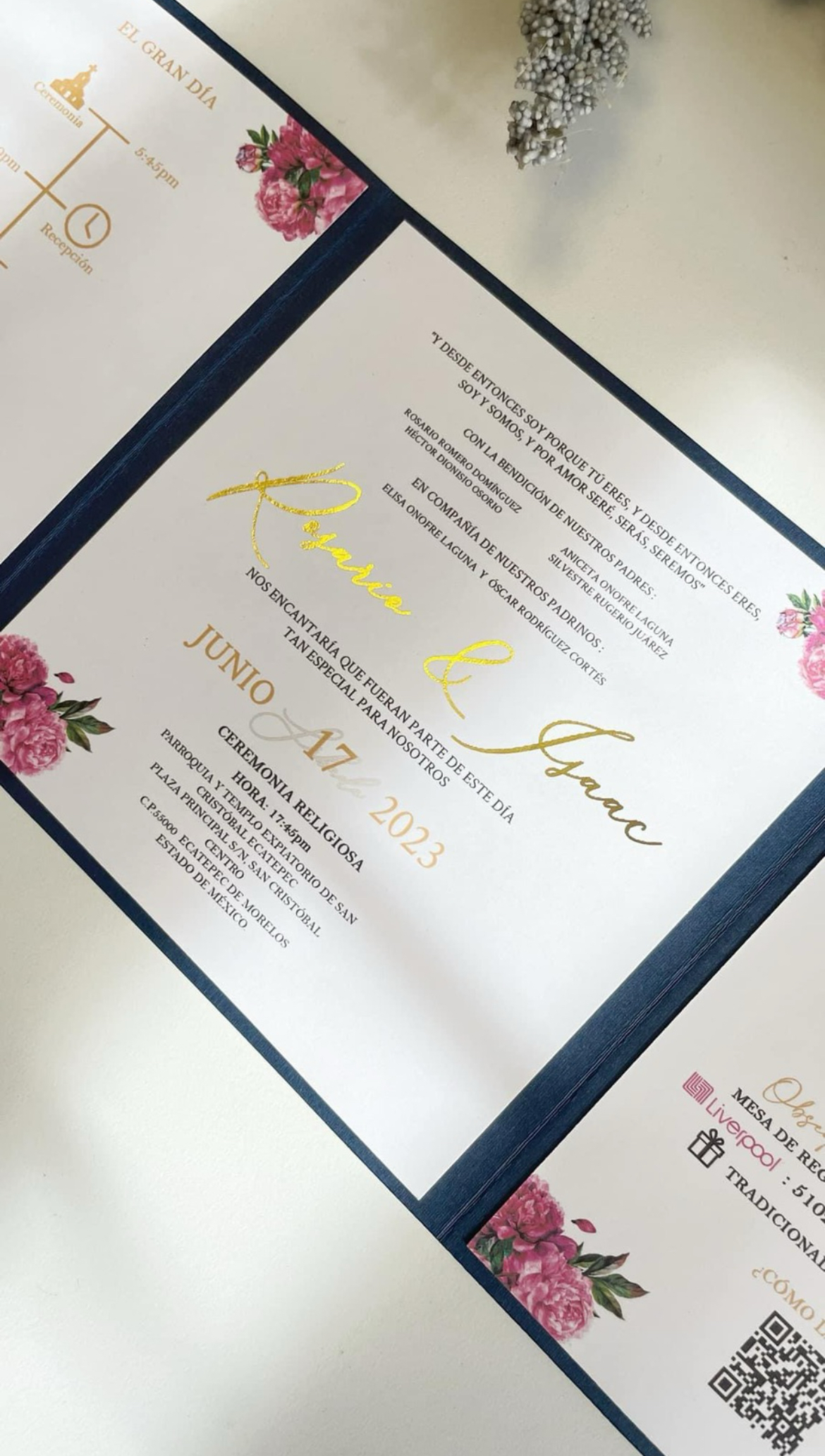 Invitación con sobre tipo tríptico de medida 14 x 14 cm en tono azul, el diseño personalizado impreso en opalina gruesa blanca con foil dorado en nombres, incluye dos tarjetas de medida 14 x 10 cm (una en cada lado), sobre de dinero blanco y para cerrar las invitaciones sello de sticker dorado.