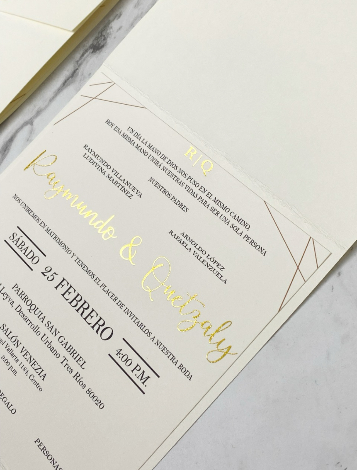 Invitación con sobre tipo tríptico de medida 14 x 14 cm en tono ivory, impresión por fuera con foil dorado, diseño personalizado impreso en opalina gruesa ivory con foil dorado en nombres e iniciales, incluye sobre de dinero y para cerrar las invitaciones sello lacre con diseño estándar.