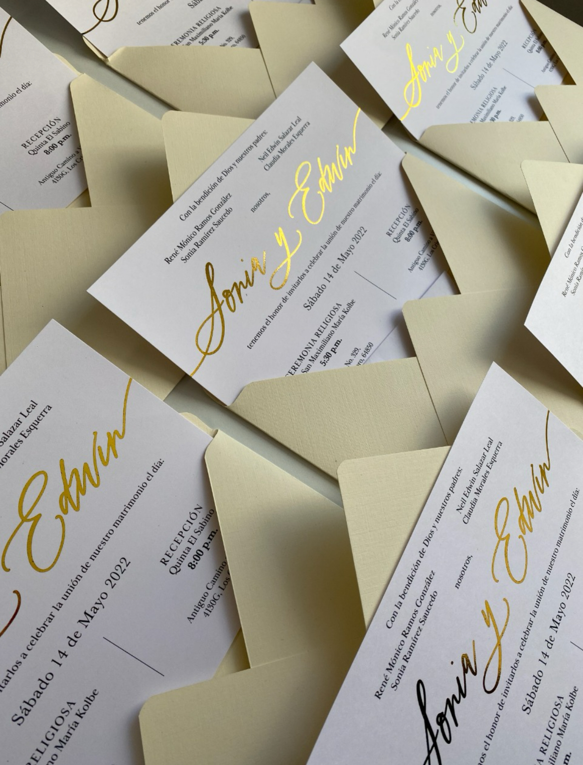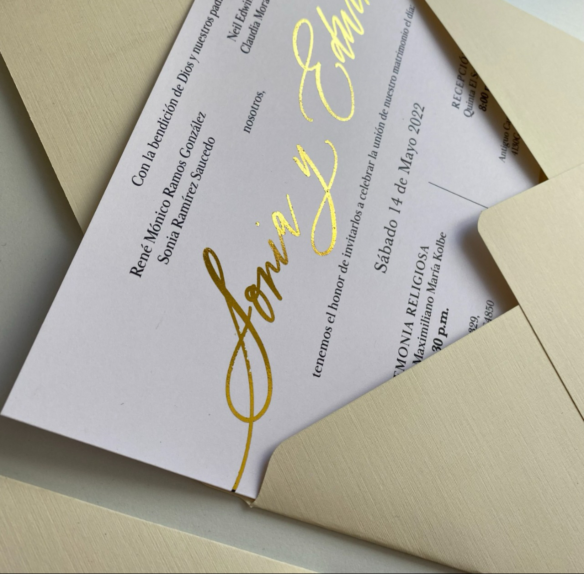 Invitación con sobre tipo tradicional de medida 14 x 21 cm en tono ivory, el diseño personalizado impreso en opalina gruesa blanca con foil dorado en sus nombres, incluye sobre de dinero blanco y pase de medida 9 x 5 cm y para cerrar las invitaciones sello lacre con diseño estándar.